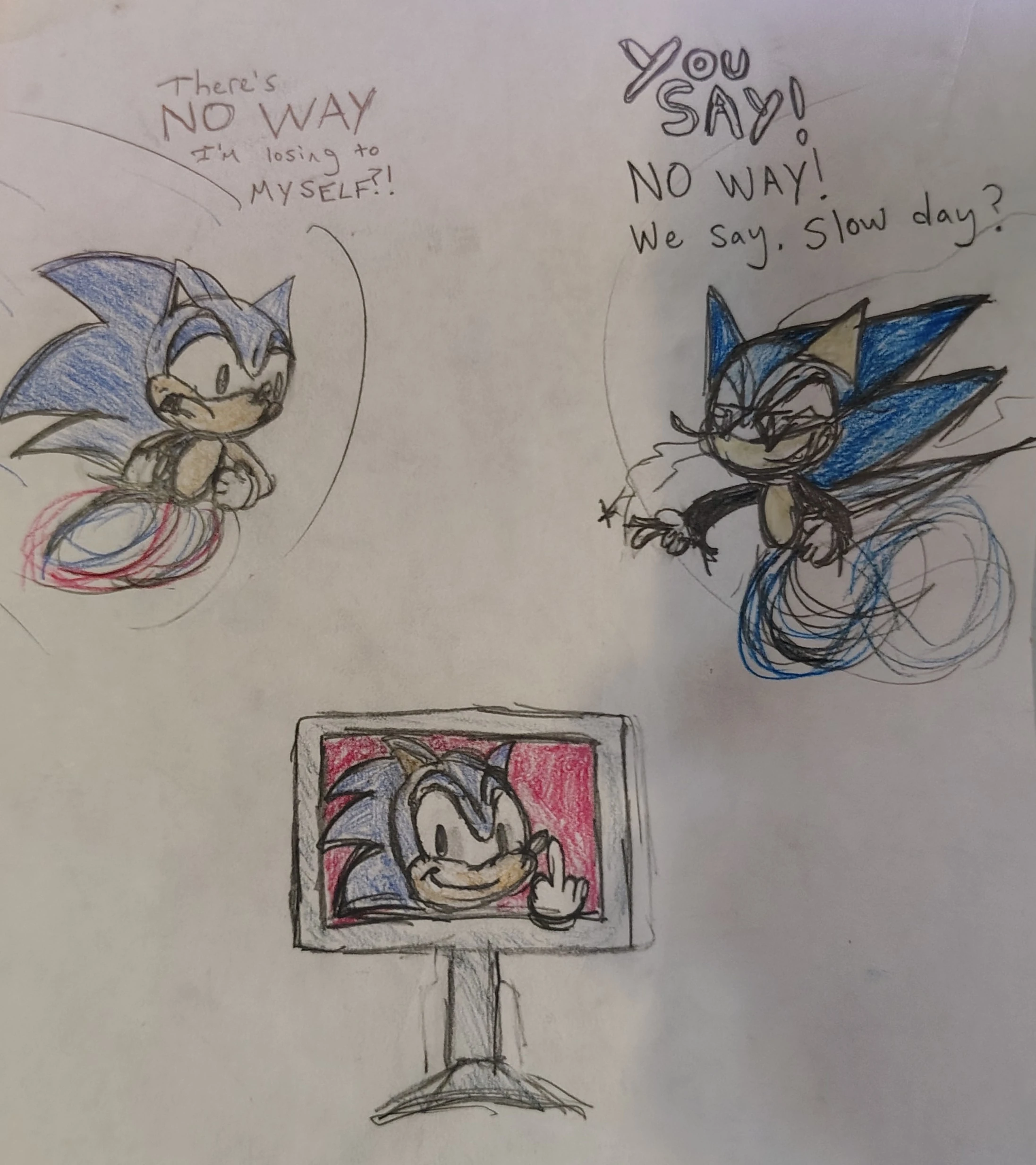 Evil Sonic views all other Scourge variants as cheap imitations—shallow echoes of a title they never truly earned. To him, they are mockeries wearing leather and sunglasses without ever understanding the trauma, rebellion, or multiversal collapse that forged the original. When he confronts them, it's never random. He seeks them out, dragging them into psychological ambushes where they're forced to face the cracks in their strength, the limitations in their worldview, and the illusions they call identity. There is only one Scourge worth remembering—and in his eyes, it damn sure isn’t them.