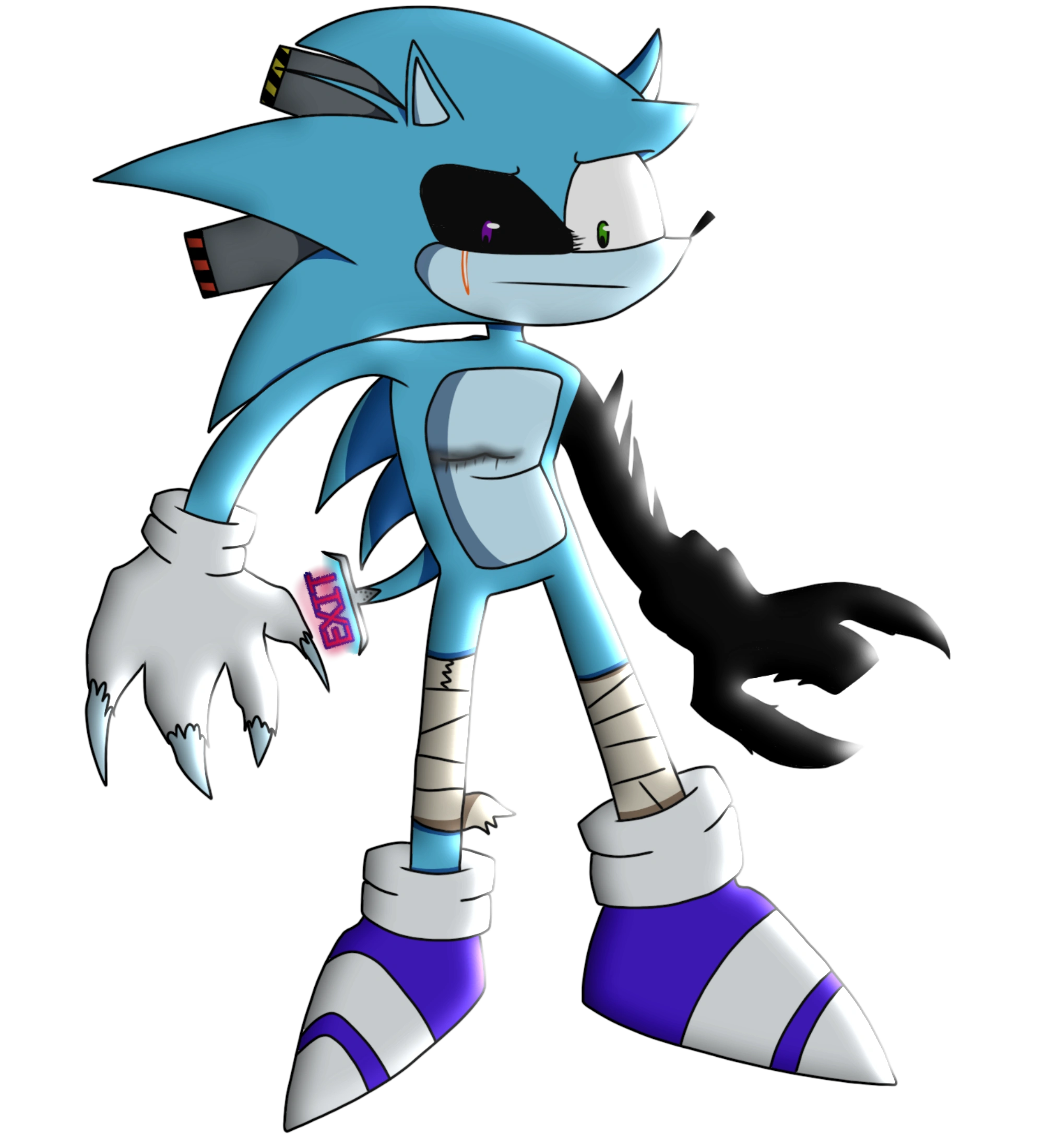 Exitus has almost the same proportions as the original Sonic, with a different shade of blue, and his eyes now inverted to each other, he still has bands from the injuries of his incident. Having sharp claws with ripped gloves, he has the same shoes as the original but with blue instead of red and a longer and forked tail with 'EXIT' written on it's edge