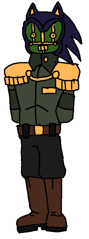 They have a appearance of a hedgehog, one that is a dark blue, and no face only being replaced with a circuit board that resembles a face. His outfit consists of being military like.