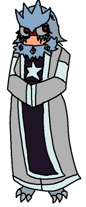A female hedgehog, more of a bird look too. She wears a robe that is light grey, with cyan rimming on the sleeves, the bottom of robe, and the middle of the sleeves. Over the robe is a cloth with cyan rimming on the sides, with a star in the middle. Her appearance on her fur is cyan, with a crest of four points, her face has no mouth, black and red eyes, icicles coming out as if they are tears. On her neck is fur, with small diamond shaped icicles.