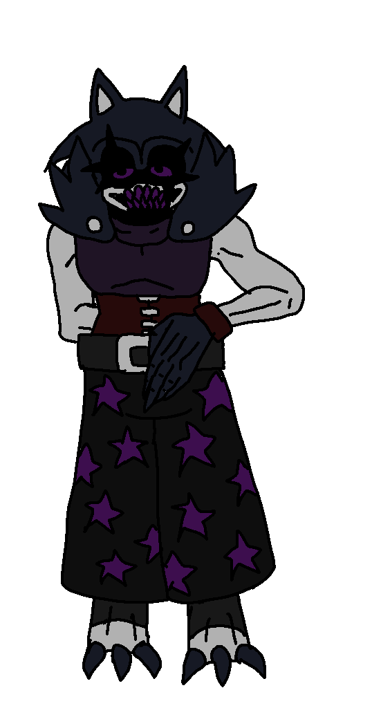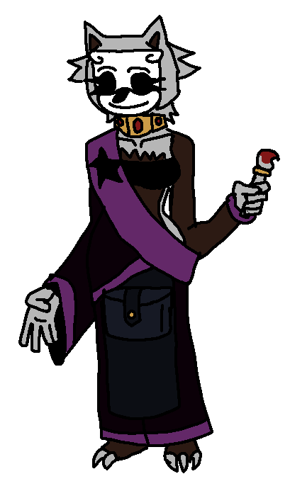 They have a appearance of a hedgehog, one that is a white color, with brown inner fur colors as well as skin. For her face, she wears a mask, with black holes on her mask for her eyes. The outfit is a off shoulder robe like outfit which is exposing the right side of the upper body, a black and purple for rimming. A Star is on the left shoulder, which is filled in black. She also wears a gold jeweled necklace, on the front of the outfit is a cloth with a pocket full of endless stuff on creation.