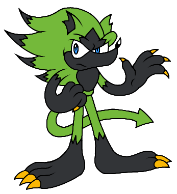 Percedrix has sap green fur with dark green colored quill tips and dark gray skin. His eye sclera are black and are surrounded by cyan eye liner. He has cyan eyes and a patch of black fur on his forehead. His backspines are split apart to resemble wings and he has a devil-like tail with a pointed end. His arms are completely dark gray except for the upper portions, which connect to the main fur with flame-like idents. His hands have white claws. His feet are dark gray and monster-like with three toes that have white nails. The seep into the lower legs.