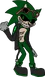 In his faker form, he resembles Scourge before absorbing the power of the Master Emerald. He sports red lensed goggles with a silver frame, blue fur, tan skin, and gray eyes. His sclera are surrounded by black eye liner. He wears a black open leather jacket, white gloves with white ring cuffs and red shoes that resemble Sonic's iconic shoes. The shoes lack a buckle and have smaller black and white socks.