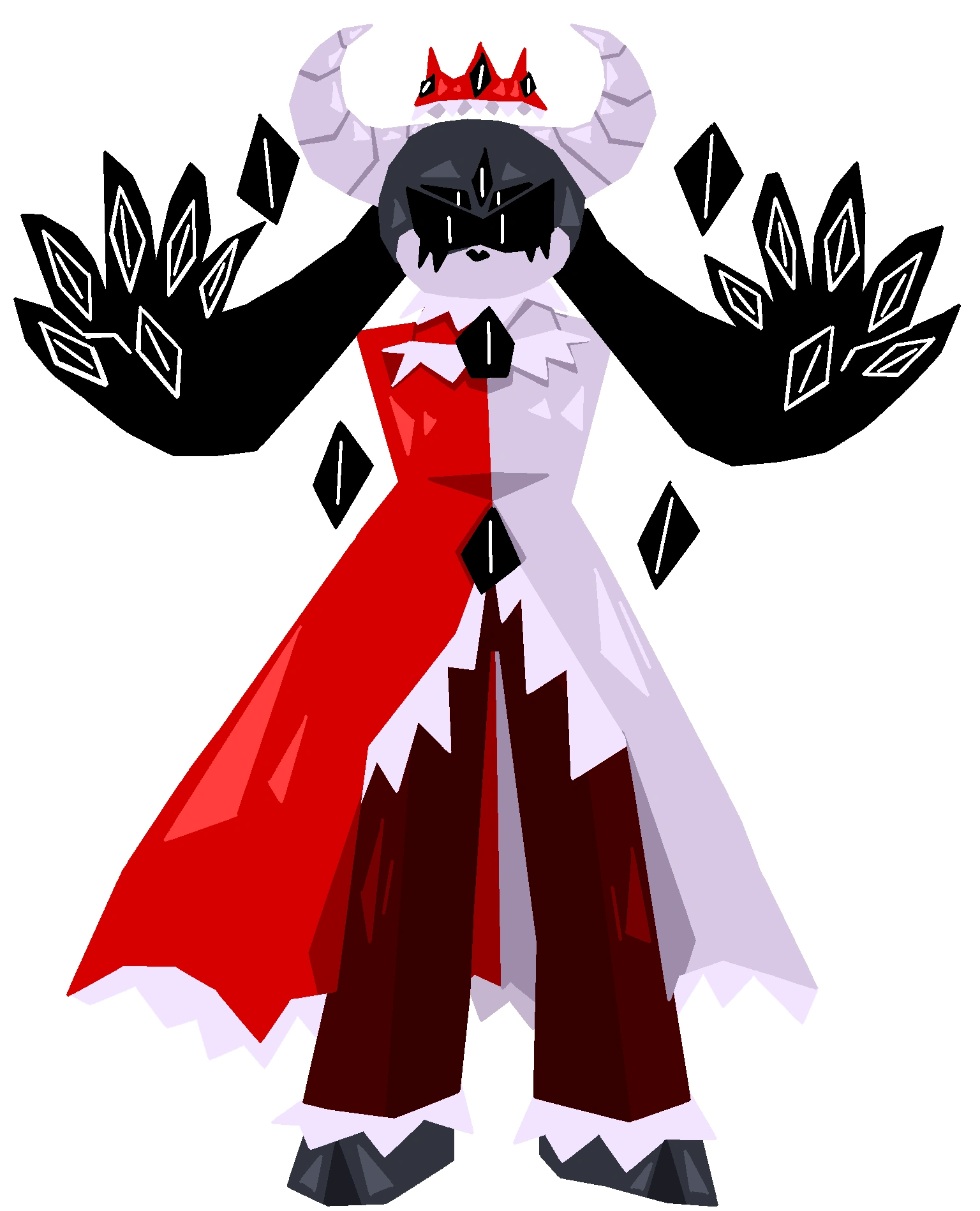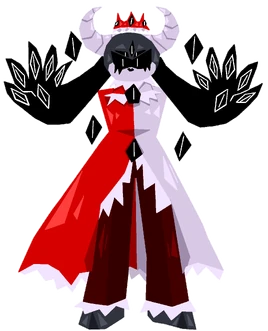 As for his outfit, he wears a red and off-white gown with frills, and an eye in the center of his collar serving as a 'crest' or centerpiece of his outfit. He wears red pants with white ruffles. He has a red crown with an eye on it. His crown also has ruffles on it.