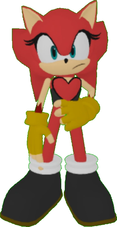 - Normal Form - In her oldest design, Reina was a salmon colored solenodon with connected cyan eyes, black eyelashes, tan skin and a tan muzzle. She wore a black shirt with a red heart similar to that of Rouge the Bat. She had dark red spiked markings on her forearms. She wore gold fingerless gloves along with black shoes that had gold soles and white socks.