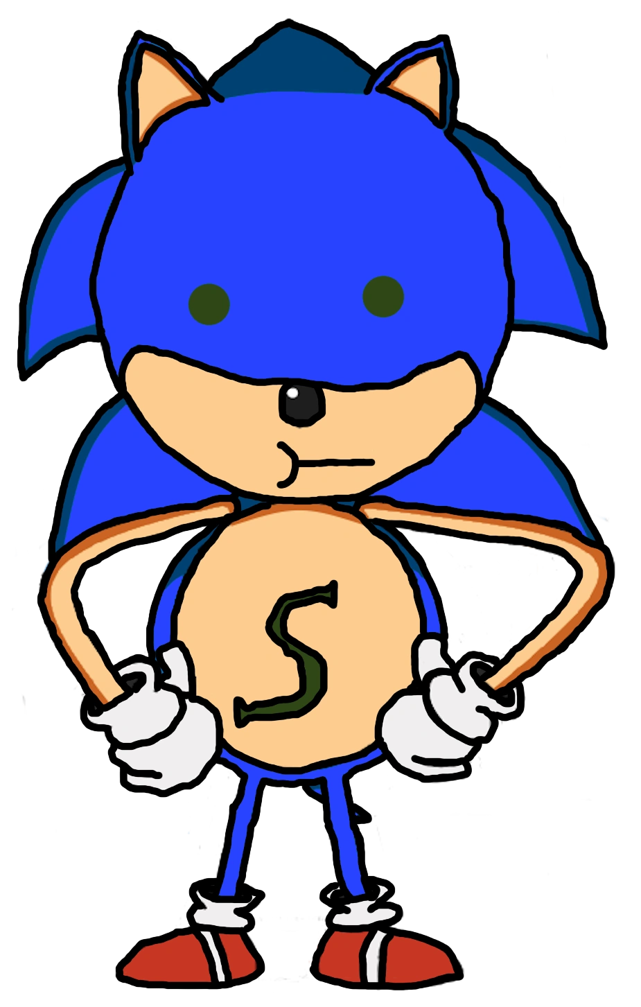 He seems to be a badly drawn version of Sonic (well, it MIGHT be bad, but that's just the ambiguity of the English language) with green dots representing the eyeballs and an S-shaped scar on his chest. His fur is also slightly bluer.