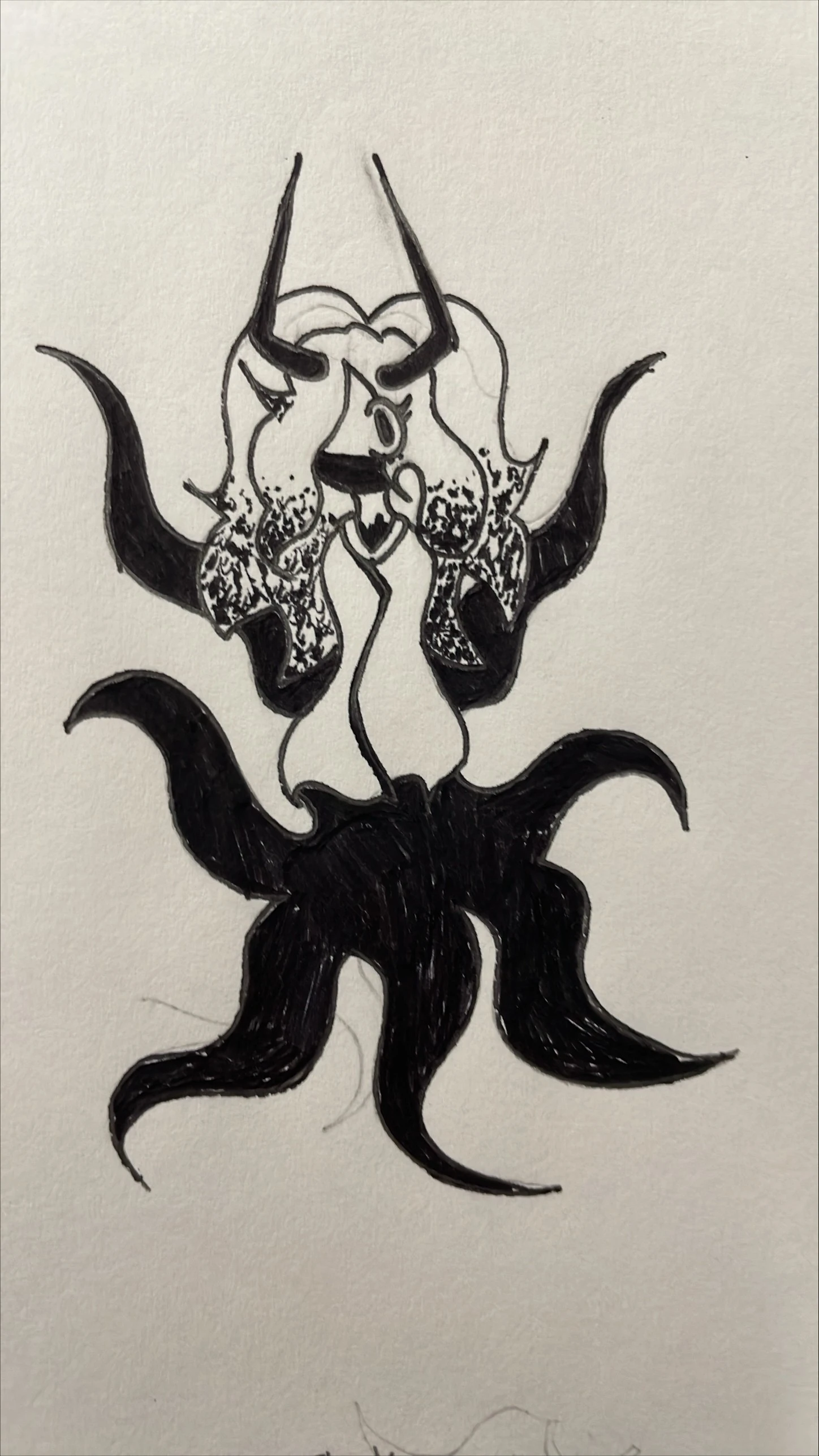 MukÅ-ka takes on the appearance of 'Dito T-T', but her hair is shorter and white. Her horns are longer and splatter across her hair like ink. Her body looks the same, but more of a black and white case.