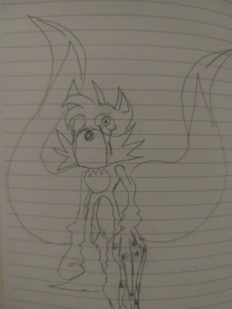 The Flesh Prince looks like Tails but his eyes a permanently squinted, he wears no shoes or gloves, his left arm is a long flesh-sword, his eyes leak antimatter, said eyes are blue, like WYST's, and the tips of his tails are extremely sharp, he's also Sonic's height