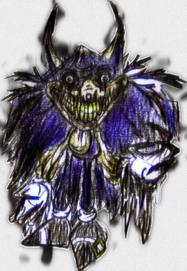 The Grim’s original state was an incomprehensible sentient mass of void matter. When it’s vessel was initially created, it was more resemblant to Sonic. However, time has taken its toll. Most of the original facade rotted away. The Grim has a wide grin, darker fur, gray shoes, etc. Its teeth are humanoid, with the addition of sharp fangs. It’s visible eyes are fake. Excess void matter leaks from the “pupils”. The Grim’s real eyes are usually hidden. In addition, it has tuffs of fur on the sides of its face similar to Lord X.
