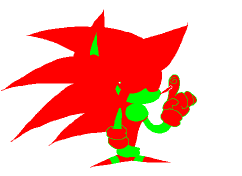 A green and red hedgehog that has red eyes, green pupils, red gloves and red and white shoes, she is mouthless